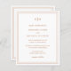 Tons de terra clássicos em um convite de casamento orçado em uma cor de terracota / ferrugem / laranja apresentando um design simples e mínimo com seu monograma no topo e seus detalhes de evento cercados por uma dupla borda. As fontes se alternam entre um script elegante, um serif tradicional e fontes sans serif minimalistas. A parte traseira tem seus detalhes de convidado junto com um Código QR opcional (se preferir, você pode remover o Código QR na ferramenta de edição de design). Este convite é excelente para um casamento formal.