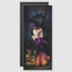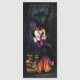 Uma bruxa loira sentada numa abóbora laranja grande. Ao seu lado está uma gata negra sentada sobre uma pilha de livros. Por trás está uma floresta e um castelo