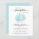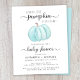 Um convite para o chá de um bebê casal bonito, alegre e econômico, com a apresentação de "A Sweet Little Pumpkin Is On Your Way" escrito em tipografia de cinzas e roteiro de na moda com pântanos, e uma aquarela azul pastel de uma abóbora. Personalize os nomes dos pais e os detalhes do chá em uma simples tipografia de cinzas moderna.