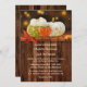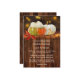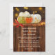 Um convite de casamento rápido e festivo com abóboras coloridas e folhas de queda com luzes de boque e um fundo de madeira escura. Este convite tem uma placa RSVP correspondente.