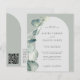 Elegante barato de orçamento verde de sábado, tudo em um convite de casamento com a arca botânica boêmica, script de tipografia simples e seu CÓDIGO QR (gerado automaticamente) para o site, RSVP on-line, acomodação e detalhes de direção. ++++++++++++++++++++++++++, LEIA ISTO ANTES DE COMPRAR! Este é um cartão de casamento de barato orçamentário impresso em uma folha de papel (cada folha tem um cartão). +++ Para obter a melhor qualidade de preço, nosso conselho é escolher o tipo de papel Semi-Gloss (é espesso o suficiente para ser usado para papelaria) +++ Se você precisar de envelopes, escolha a OPÇÃO ENVELOPE. ++ Verifique duas vezes todas as informações e a ortografia do seu texto porque você receberá exatamente o que você vê - ninguém mais verificará nada antes de imprimir. +++ Esta placa foi projetada para o tamanho de 4,5" x 5,6". Caso você escolha outro tamanho do cartão e o texto saia da página, tudo precisa ser corrigido antes de adicionar o produto ao carrinho. Peça ajuda ao Serviço de Design ao Vivo.