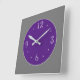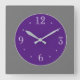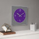 Um lindo relógio simplista com um fundo de cinzas e um centro roxo. Os recursos adicionados incluem algarismos brancos e mãos prateadas. Disponível em formas quadradas e redondas