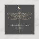 O cartão de visita quadrado moderno apresenta libélula celestial dourada com ilustração lua crescente sobre fundo de cinza escura com texto contemporâneo branco na frente, e texto de cinza com código QR personalizável para seu site ou mídia social na parte traseira.