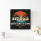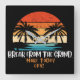 Um relógio com um pôr do sol sobre palmeiras, a praia com guarda-chuvas e cadeiras de praia, com a frase "Break from the Grind" centrada abaixo da imagem. A design sugere uma fuga pacífica e relaxante do estresse diário, evocando imagens de um paraíso tropical.