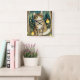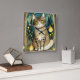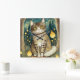Relógio de parede com design de gato, com um olhar macio, na floresta, cercado por vagalumes. Um desenho bonito, gracioso, ingênuo e infantil. Imagem quadrada.
