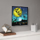 A jovem bruxa voando entre o relógio da noite do céu. Na luz azul da noite à meia-noite, esta jovem bruxa está a apanhar o seu voo. É uma lua amarela cheio, com morcegos e lanternas.