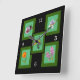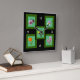 Cinco flores diferentes (ameixa, íris, daffodil, calendário e lilac) são colocadas sobre fundo claro com quadros verdes escuros. Uma imagem fica em cada canto com a quinta imagem colocada sobre ela no centro. Os quadros são definidos em fundo preto. Números brancos em 12, 3, 6 e 9 posições.