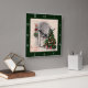 Relógio de férias com uma cena de janela de natais vintages da árvore de Natal e luzes brilhando à noite por uma bela janela, borda verde e números destacados.