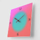 Um relógio minimalista muito brilhante e simples em rosa/laranja misturado com um centro verde redondo claro. Numerais pretos minimalistas para combinar.