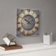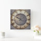 Um relógio de parede rústico que parece ser feito de madeira velha