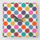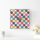 O Custom Wall Clock tem um design de bolinhas multicolorido e bonito em vermelho, verde, amarelo, azul, laranja, rosa, lacre e roxo.
