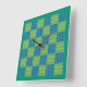 Um Relógio de Parede na moda e atualizado, com um padrão geométrico de "retalhos" em Emerald Green, Tender Shoots Green e Mônaco Blue.