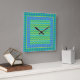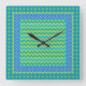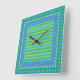Um relógio de parede quadrado, com uma mistura de "luas azuis" "não combinam padrões de Chevrons e Bolinhas em Azul Dazzling, Neon Verde, Turquoise e Emerald Green. Parte da coleção Posh & Painterly 'Blue Moons'; de um design de colagem de papel pintado à mão por Judy Adamson.