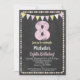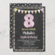 Um convite para o 8.º aniversário, cor-de-rosa e amarelo, com texto a giz, no topo, com fundo de chalkboard, bandeiras e uma bela borda poka-dot.
