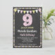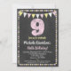 Um convite para o 9º aniversário, cor-de-rosa e amarelo, com texto a giz, no topo, com fundo de chalkboard, bandeiras e uma bela borda poka-dot.