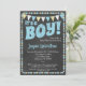 Um convite para o chá de fraldas azul e amarelo, com um texto desajeitado "É Um Menino!" no topo, com fundo de quadro negro, bandeiras e uma bela borda poca-ponto.