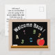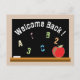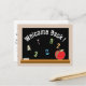 Um simples mas hetero ao ponto postal para receber seus alunos de volta à escola. Na frente, tem a ilustração de um quadro negro. Sobre ele, diz "Bem-vindo de volta!" (Você pode mudar esta saudação se quiser.) Tem também as letras A , B , C e os números 1 , 2.3 gravados em gizes de cor clara. Também tem uma maçã vermelha no canto inferior direito. No verso, você pode personalizá-lo com seu próprio texto (data e hora em que a escola começará ), há também espaço para adicionar o nome e a assinatura do professor, assim como o número da sala. © ArianeC Ilustrações