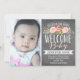 Mande aos seus entes queridos um anúncio especial de nascimento. Este anúncio apresenta lindas flores aquáticas e uma mistura de tipografia moderna, tudo sobre um fundo de chalkboard de tendências. Para um anúncio ainda mais memorável, selecione uma forma recortada e/ou papel luxo para um toque especial extra! Personalize com sua foto e detalhes usando os campos de modelo fornecidos.