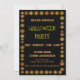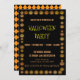 Convite para festas de Halloween com quadro jack o' lanterna com um fundo preto dramático. No outro lado da placa há um padrão de verificação preto e laranja.