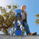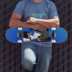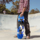 O skate azul da Menina de Anime. Linda anime garota de fundo azul. Incrível conselho ocular e único.