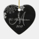Enfeites de natal Coração-dados forma do quadro efeito preto. Os primeiros enfeites de natal do casal simples com a foto na inicial da parte dianteira e do monograma na parte traseira com flocos de neve brancos. Elke Clarke©. Para newlyweds e pais recentemente de casais como uma lembrança de seu dia do casamento. Os flocos de neve brancos e e a banda opaca junto com sua foto do casamento compo este design à moda. Para mais opções de edição, incluindo fazendo seu ajustado da foto, seleto "personalize-o" para o menu da edição.