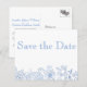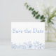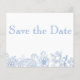 Um bonito formato postal Wedding Salvar o folheto de Anúncio de Data para o orçamento com conhecimento de Bride e Groom. Na parte frontal do folheto está uma imagem branca transparente que permite que qualquer cor de fundo seja exibida. O delicado padrão de flores silvestres aparecerá na cor escolhida. O reverso do folheto tem um tema de tipografia simples e é apresentado em formato postal.