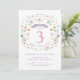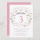 Este elegante e bonito terceiro convite de aniversário apresenta uma coroa floral ilustrada com a expressão "Celebração de Vamos" em torno do número 3. A cor do texto, a fonte e a mensagem podem ser alteradas para seu gosto. A parte de trás do convite apresenta um fundo cor-de-rosa (que pode ser trocado para qualquer cor da sua escolha) com um padrão quatrefoil branco. Uma maneira perfeita de convidar convidados para comemorar o aniversário especial de uma garota.