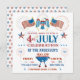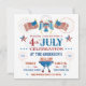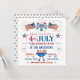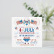 4o do convite de festas de julho. Decorado com elementos patrióticos do divertimento: bandeiras americanas, águia, fogos-de-artifício, grade do churrasco, águia americana, e estrelas. Para trás do cartão tem um teste padrão de estrela. Clique sobre o azul "personalizam-no" botão e adicionam-nos seu próprio texto. Ilustração original pelo pj_design. Feliz 4o julho! Ajuda da necessidade - envie-me por correio electrónico.