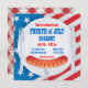 Quarto do convite do Cookout de julho com placa de papel, cachorro quente, e a bandeira americana. Do guingão do fundo parte traseira sobre. Personalize com seu próprio texto. Ilustração original pelo pj_design.