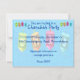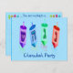 Quatro dreidels coloridos que mostram a freira, o gimel, o hei, e a canela. Logro de Nes Gadol Hayah. Um design de Chanukah. Convites de festas customizáveis de Chanukah--adicione e personalize com sua informação.