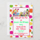Este convite de aniversário é decorado com uma pintura de quatro palhaços de circo e balões coloridos.