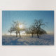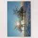 Árvores ao nascer do sol no inverno com neve e sol no nevoeiro matinal