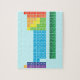 Quebra-cabeça com mesa periódica dos elementos, com cada grupo de elementos marcado em cores arco-íris.