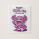 Design bonito com um axolotl vestindo uma mochila e segurando uma grande caneta com a citação "Feliz 100º dia da escola". Feliz 100 dias de escola ou Feliz 100º dia do jardim de infância.