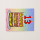 Este quebra-cabeça de aniversário alegre e colorido apresenta uma representação em estilo de desenho animado de um bolo de aniversário de três níveis com velas em forma numérica no topo mostrando o número "13", juntamente com a mensagem "HAPPY 13 BIRTHDAY", e um nome de destinatário personalizado. O plano de fundo apresenta um espectro de arco-íris pastel de várias cores inspirado em gradiente. Um quebra-cabeça de aniversário alegre e personalizável como este poderia ser usado para celebrar o décimo terceiro aniversário de alguém. [~Z0000621]