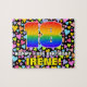 Este vibrante e excitante design de quebra-cabeça de aniversário apresenta um grande número "18" com um padrão de gradação inspirado no espectro multicolorido do arco-íris, juntamente com a mensagem "FELIZ 18º ANIVERSÁRIO", e um nome de destinatário personalizado. O fundo apresenta um padrão otimista de corações amorosos com várias cores e tamanhos. Um quebra-cabeça de aniversário colorido e editável como este pode ser usado para reconhecer o décimo oitavo aniversário de alguém. [~Z0000611]