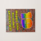 Esta vibrante e empolgante arte urbana de rua e grafite de quebra-cabeça de design de aniversário tematizado apresenta um grande número "19" com um padrão colorido inspirado no espectro do arco-íris, juntamente com a mensagem "Feliz 19º aniversário", e um nome personalizado. O fundo apresenta um padrão de parede de tijolos. Uma quebra-cabeça de aniversário colorida e personalizável como esta poderia ser dada para celebrar o 19° aniversário de alguém. [~Z0000545]