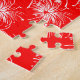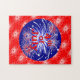 Um divertimento 4o do quebra-cabeça de julho coberto com os fogos-de-artifício vermelhos e brancos, círculo azul profundo em um fundo vermelho brilhante.