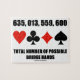 Mostre sua ponte tortuosa/lado da ponte duplicada com este quebra-cabeça de quebra-cabeça com os quatro naipes de placa junto com o seguinte ditado: "635, 013, 559, 600 Número Total de Possíveis Mãos-ponte". Faça com que outros façam uma dupla avaliação do número de combinações possíveis entre 13 cartões que existem, de fato, uma vez que uma mão foi resolvida! Um jogador de ponte definitivamente não viverá para tocá-los a todos!
