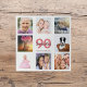 Um presente para o 90 de aniversário de uma mulher, celebrando sua vida com uma colagem de 8 fotos suas. Modelos para um nome, 90 anos e uma data. Data de nascimento ou data do aniversário. Coral e letras coloridas burladas. Fundo branco.