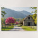 Uma estrada de terra vai entre um velho celeiro de pedra e árvores rebentadas florescentes, com colinas à distância, nesta bela quebra-cabeça do Vale de Shenandoah.
