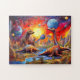 Um trabalho de arte vívido ao estilo do abstrato, de cores do arco-íris de dinossauros percorrendo os planetas da galáxia.
