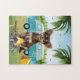Um cão Chihuahua sentado perto do arquivo do acampamento e tenda com carrinha de camper no fundo do rio é uma quebra-cabeça perfeita se você for acampar.