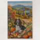 Celebre a beleza do outono com esta pintura vibrante de um cão sentado ao lado de uma bela colheita de Ação de Graças. As ricas cores do outono de abóboras, girassóis e paisagem rural rústica criam uma atmosfera quente e convidativa, perfeita para a decoração sazonal de qualquer amante de cachorro.