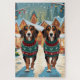 This festive design captures the joyful spirit of the holiday season, featuring an adorable dogs.Nestled in a winter wonderland, complete with a decorated Christmas tree, and beautifully wrapped presents. Snowflakes gently fall, adding a magical touch to the scene, while the vibrant colors of the holiday decorations create a warm and cheerful atmosphere.