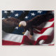 A quebra-cabeça de 4 de julho vem com uma bela Águia Balda voando na frente e olhando com uma bandeira americana atrás dele. Esta é uma bela foto nesta quebra-cabeça