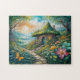 Uma cabana pitoresca aninhada por um caminho tranquilo, rodeada por um verde-luxuoso, flores vibrantes e uma ponte de madeira, criando uma atmosfera mágica e pacífica.