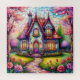 Uma cena vibrante de uma cabana branca rodeada de flores florescentes, com janelas de vidro manchadas e detalhes intrincados criando uma atmosfera mágica.