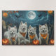 Libere o espírito assustador com esta design sombria do Dia das Bruxas apresentando um bando de cachorros sob um céu escuro e iluminado, cercado por morcegos voadores e abóboras brilhantes. Perfeito para aqueles que amam um toque de diversão terrível com seus amigos peludos!