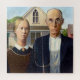 Este é o clássico quadro Grant Wood, American Gothic, mostrando um fazendeiro e sua esposa parados em frente à sua fazenda, ele com seu garfo de jarra, sua olhando de lado para ele.